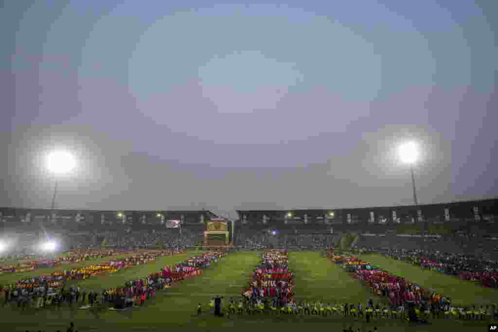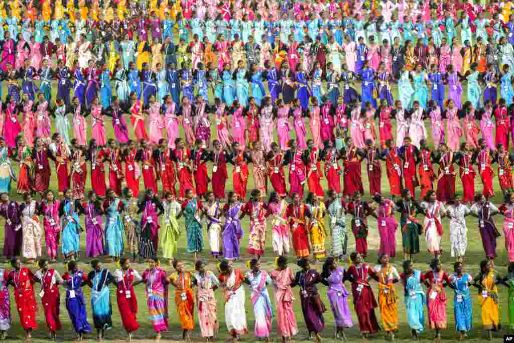 বিশ্ব রেকর্ড তৈরির চেষ্টায় ভারতের গুয়াহাটিতে আয়োজিত হতে চলা এক নৃত্যানুষ্ঠানের দুই দিন আগে মহড়ার সময় আদিবাসী তরুণ-তরুণীরা ঝুমুর নাচ পরিবেশন করছেন। শনিবার, ২২ ফেব্রুয়ারি, ২০২৫।