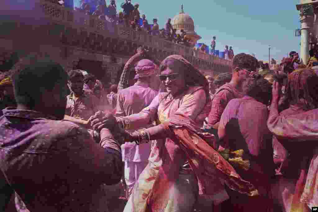 ছবিতে ভারতের নয়াদিল্লি থেকে ৭০ মাইল দক্ষিণে অবস্থিত বরসানা এবং নন্দগাঁওয়ের গ্রামবাসীদের নন্দগ্রাম মন্দিরে হোলি উৎসবে অংশ নিতে দেখা যাচ্ছে। রবিবার, ৯ মার্চ, ২০২৫।